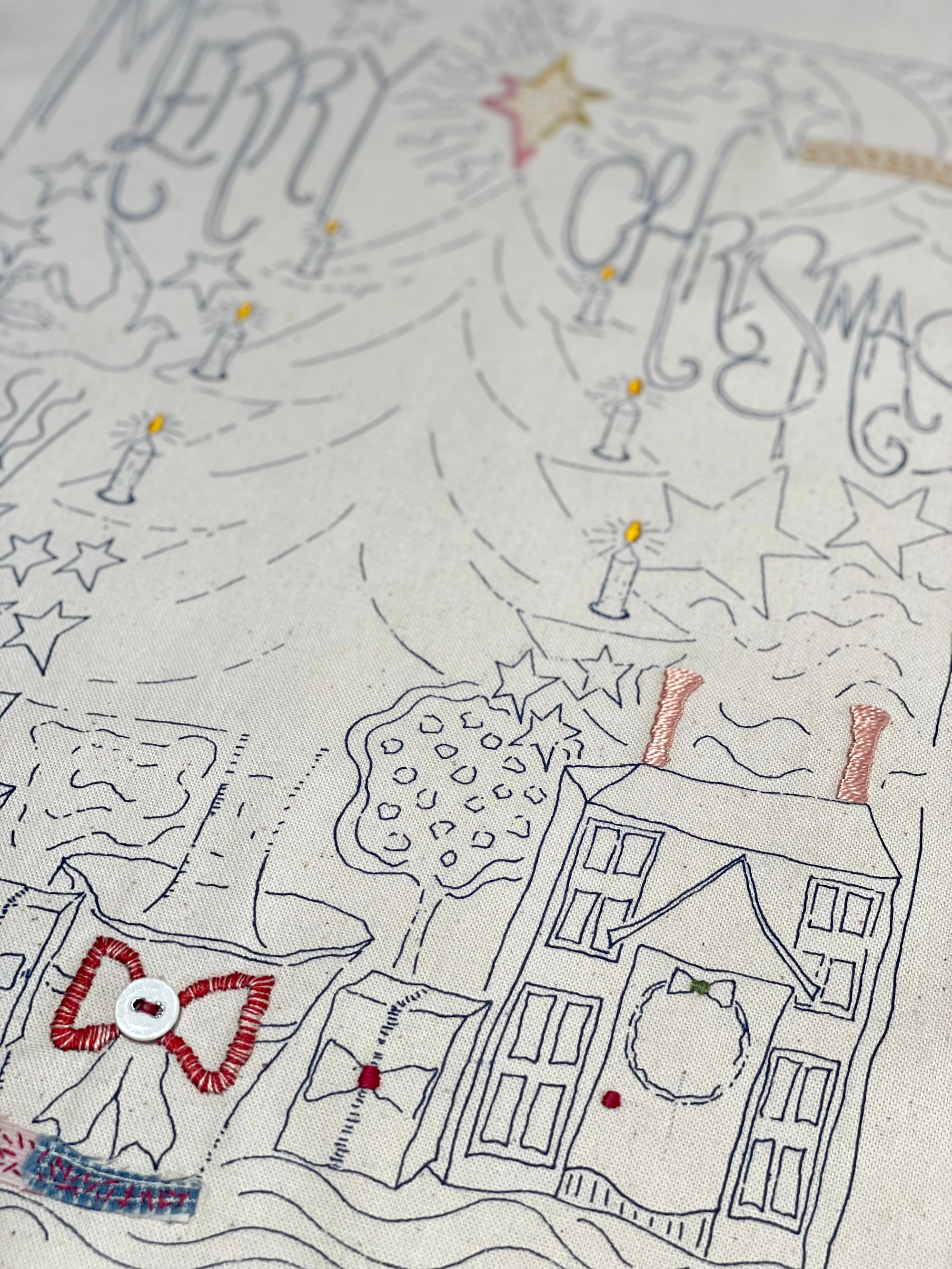 I hope that you too can find joy in the process of slow stitching and making marks with your needles, threads and fabrics to create your own unique stitched story. In my own version of this festive design, I plan to cover the print almost entirely with stitches, leaving none of the template visible. Whether or not you choose to leave any of the print showing is a matter of personal preference.